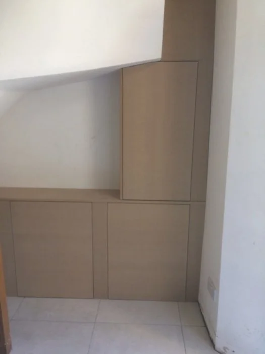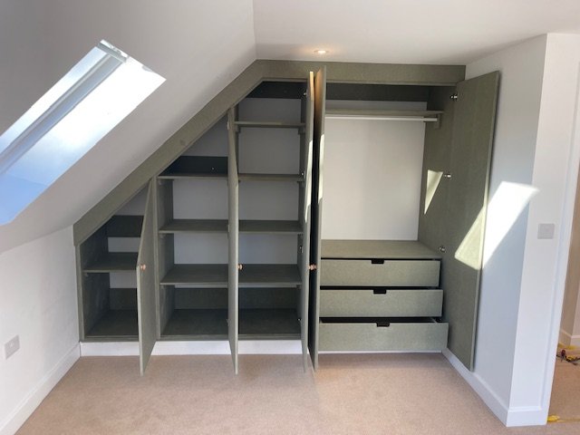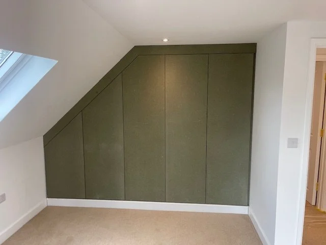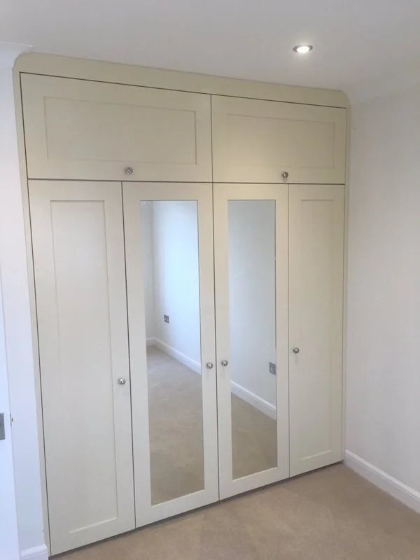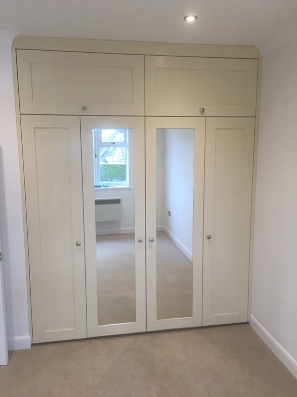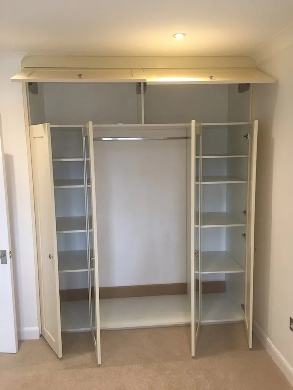 Bespoke fitted wardrobes with soft close top box storage , shelves & hanging rail . Powder coated laminate paint finish