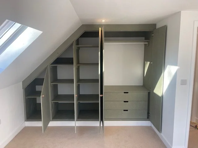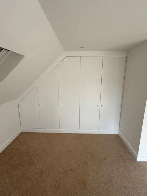Bespoke MDF wardrobes incorporating shelves & hanging rail finished in satin white