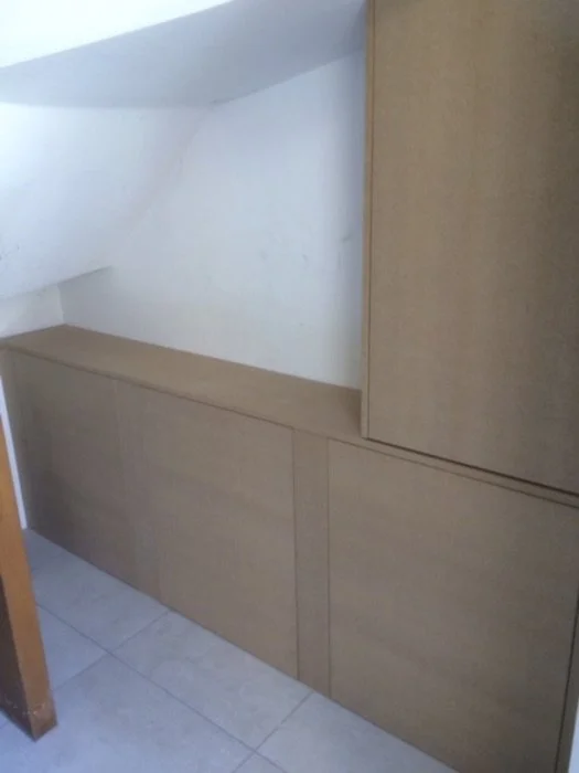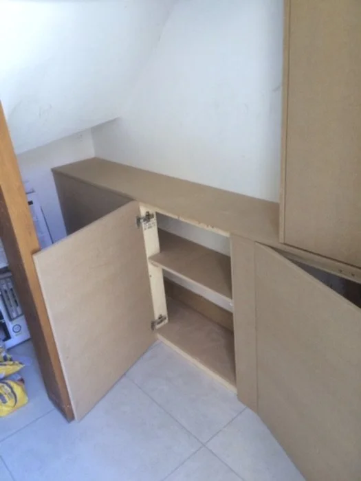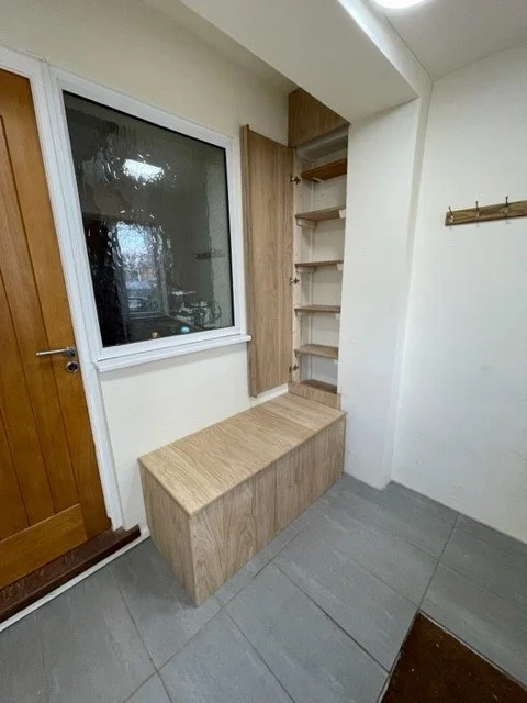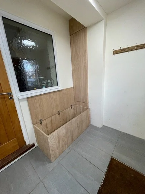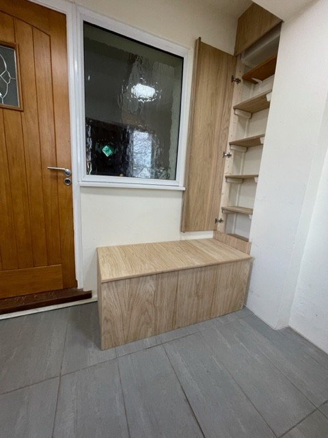 Custom made ottoman & shoe cupboard made from oak veneered MDF
