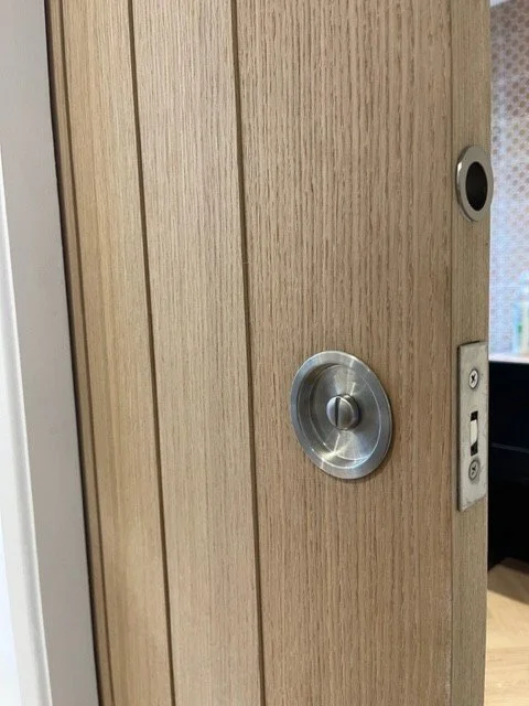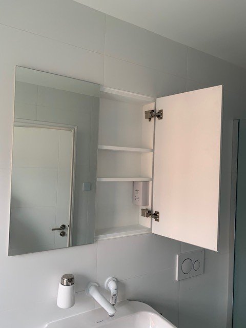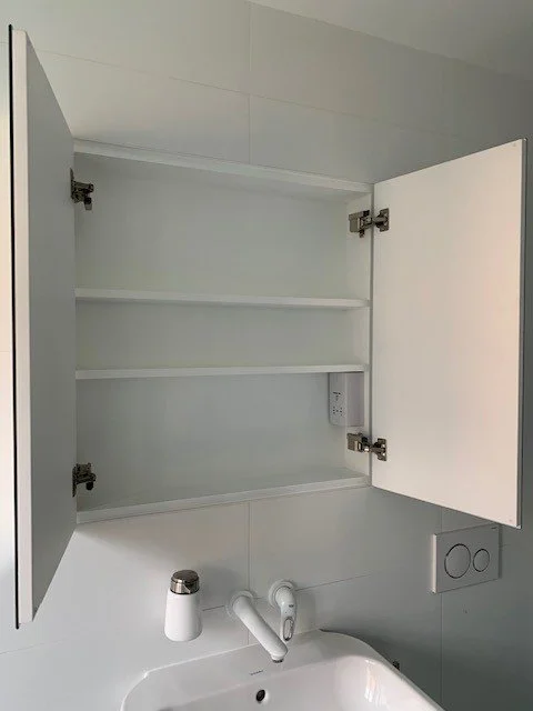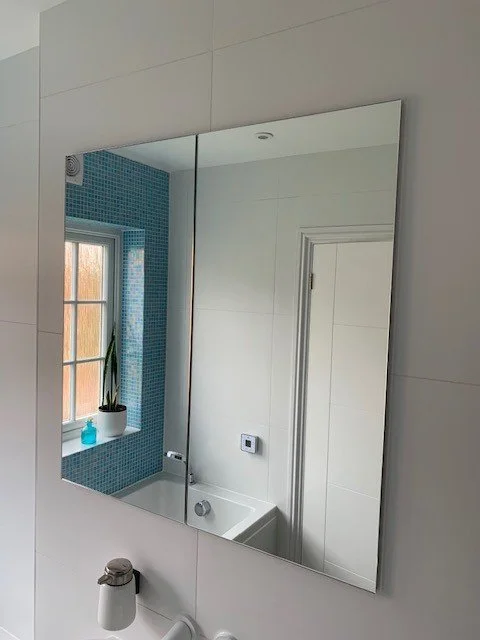Bespoke flush recessed bathroom mirrored cabinet incorporating soft close hinges and shaver socket point