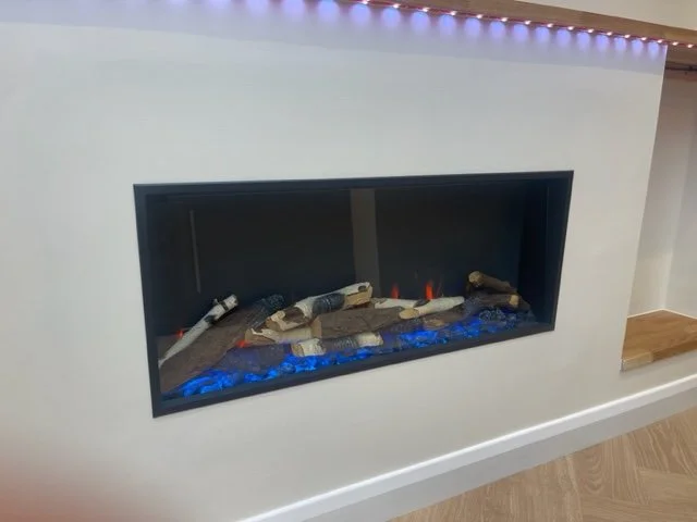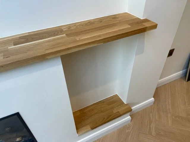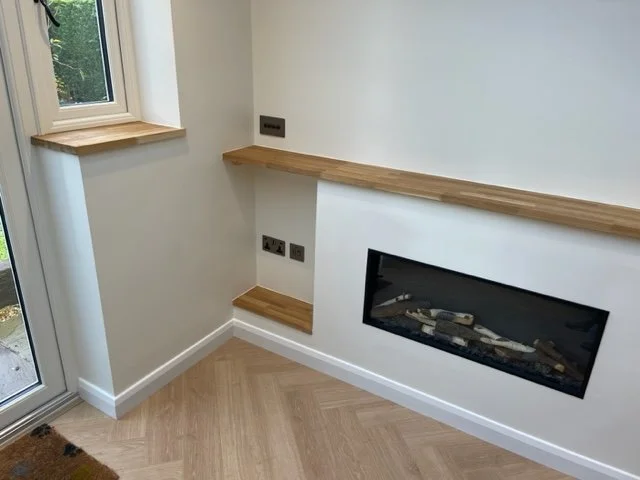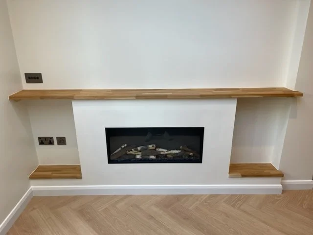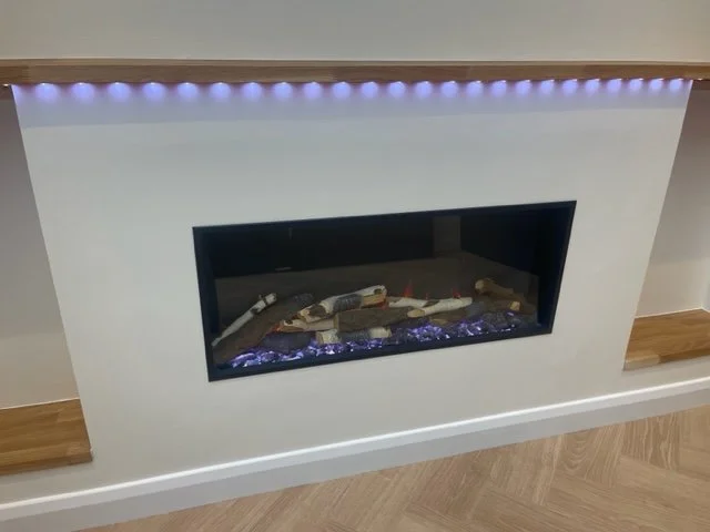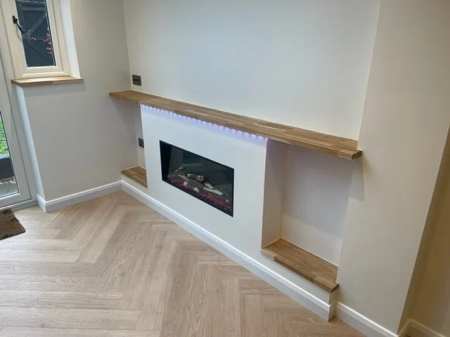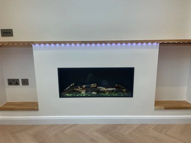 Bespoke housing incorporating the electric fire set flush into the finished plastered boxing with solid oak block shelving & L.E.D light feature strips