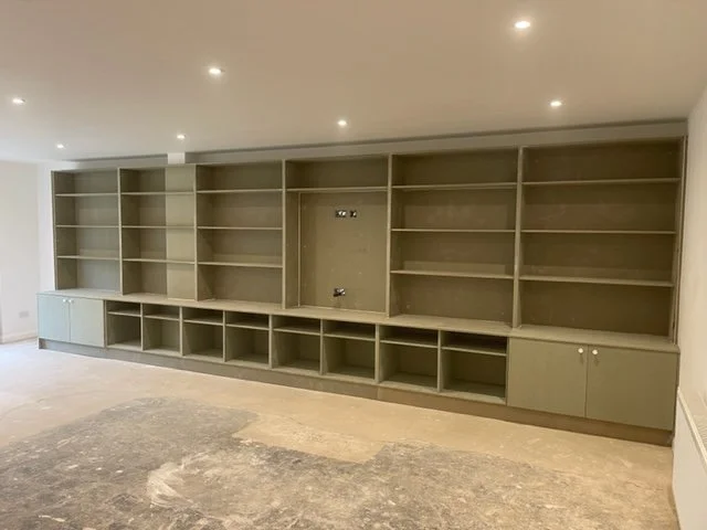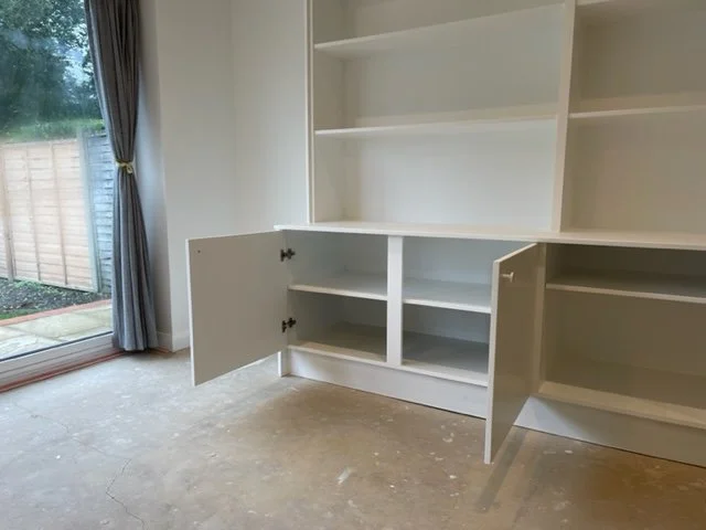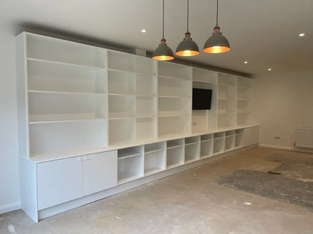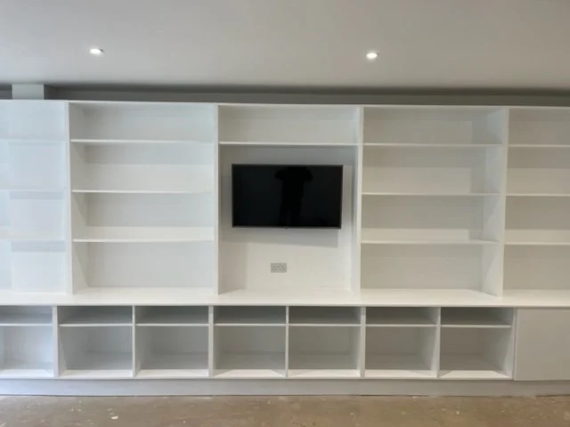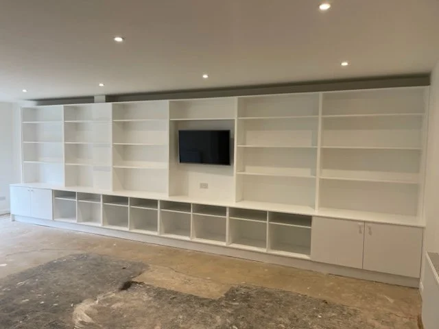 Bespoke bookshelves incorporating cupboards with soft close hinges , concealed power for media & painted in a white soft satin high durable paint finish
