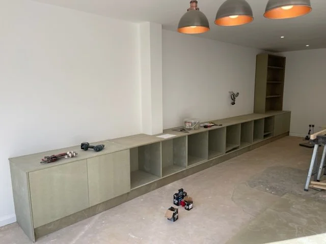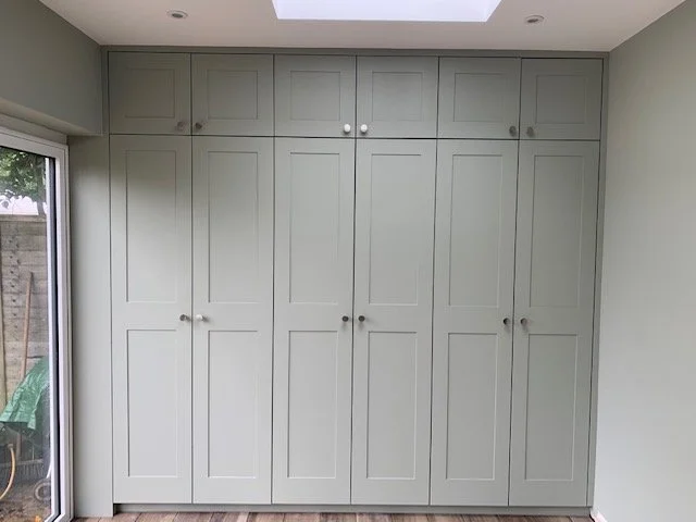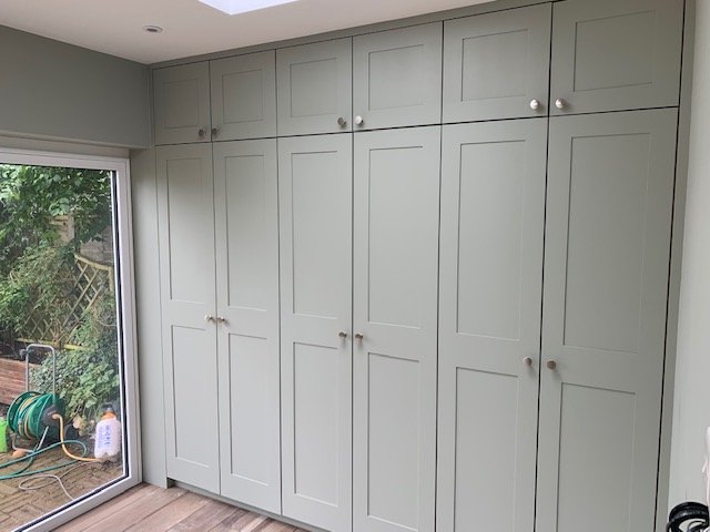 Hand made bespoke shaker style cupboards incorporating top box storage , shelved internal storage compartments and sprayed in heritage paint colour