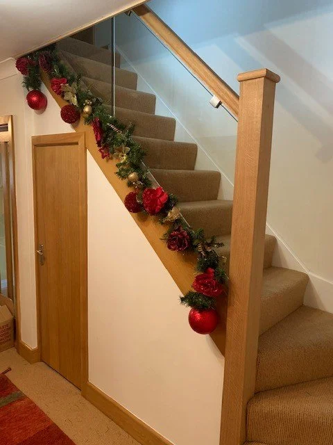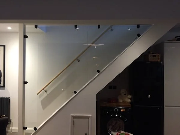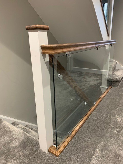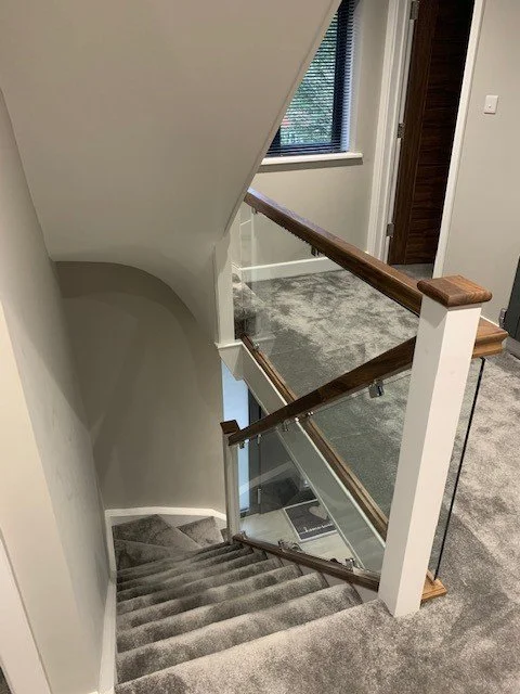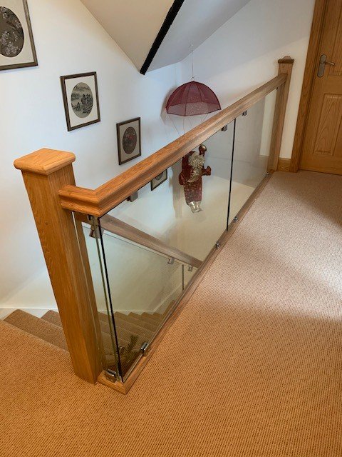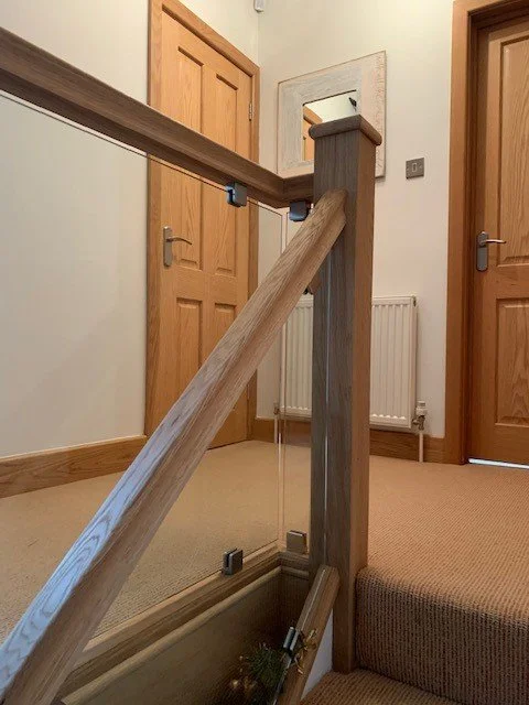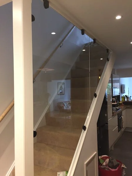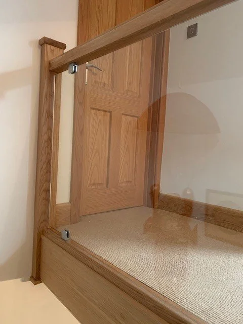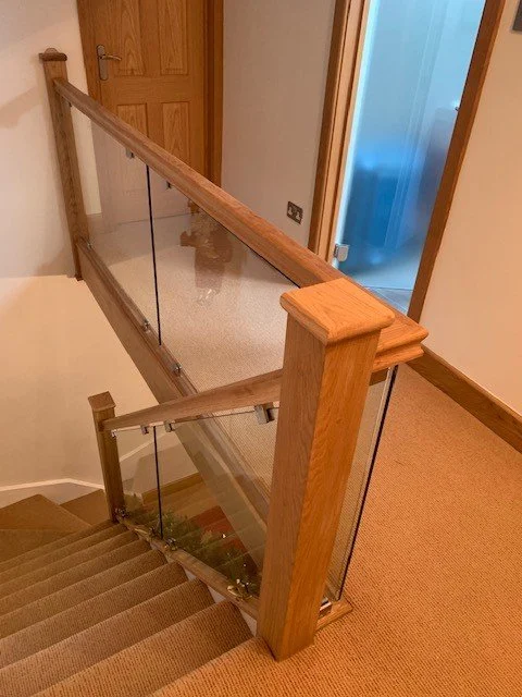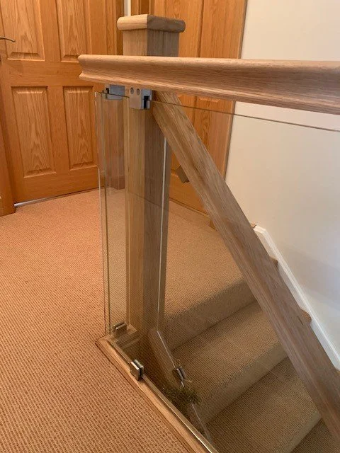 Standard softwood staircase with over clad oak veneer & 6mm toughened glass balustrading with chrome glass clamps