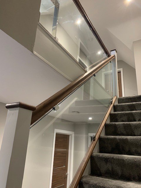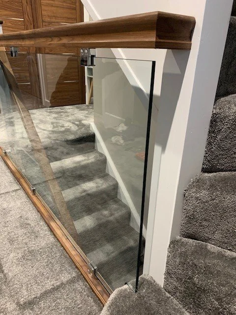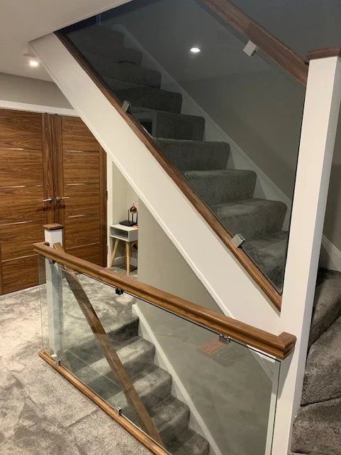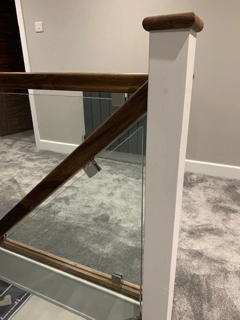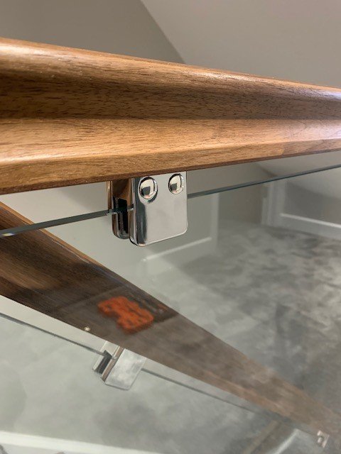 Bespoke walnut/glass staircase with chrome fittings and walnut handrails & base rails