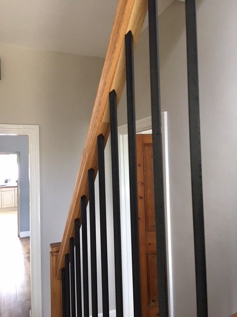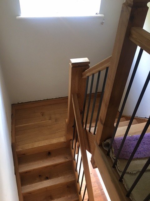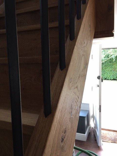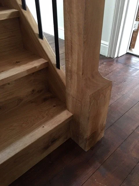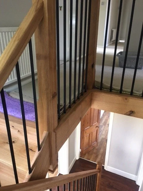 Rustic oak staircase incorporating black iron inset spindles & hand carved posts & handrails