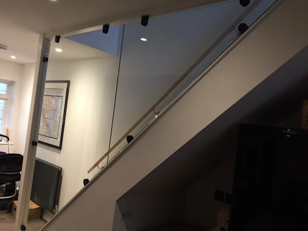 Fully enclosed toughened glass staircase with powder coated black clamps