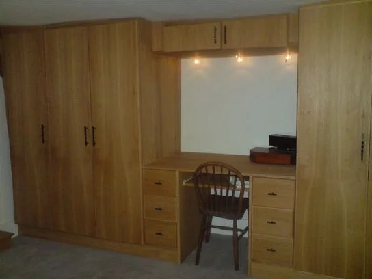 European oak fitted wardrobes incorporating L.E.D lighting above desk area