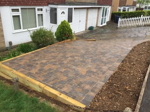Tumbled block paved driveway with retaining sleeper walls