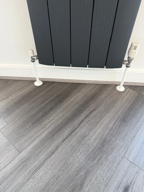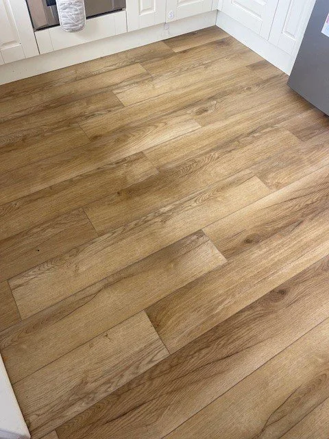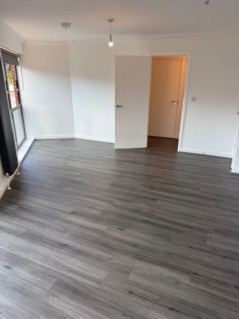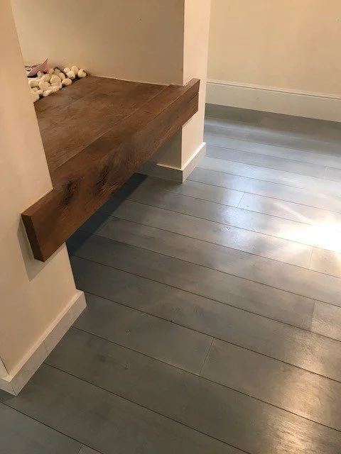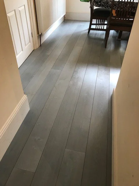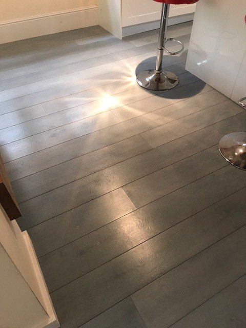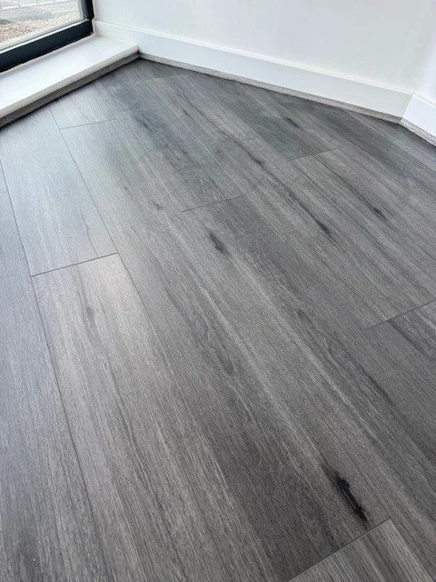 Grey wood effect luxury vinyl plank flooring with a subtle driftwood tone