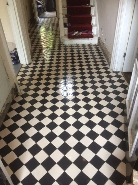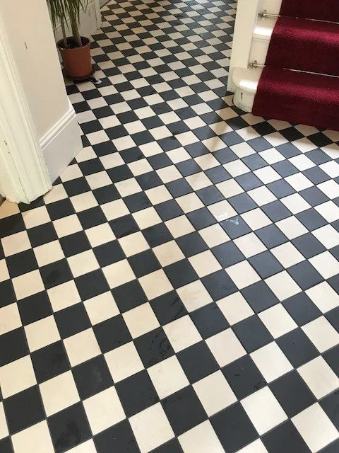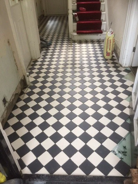 Traditional individual Victorian encaustic tiles laid in a diamond pattern