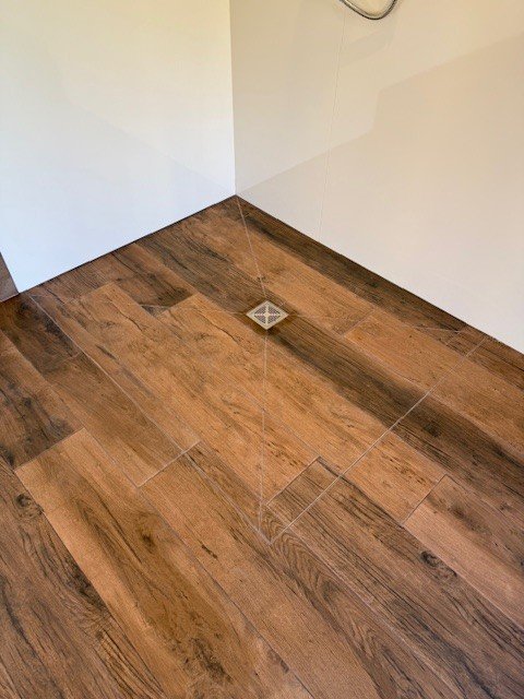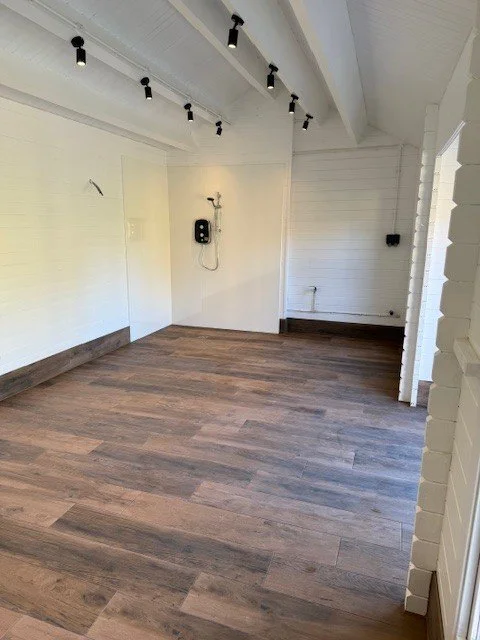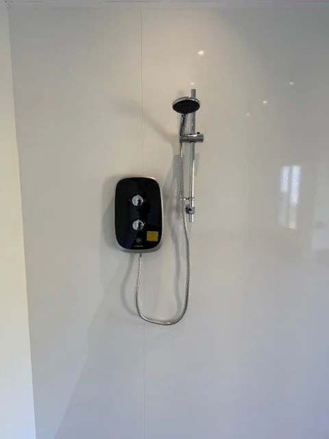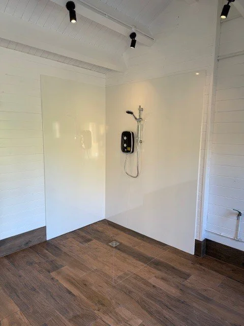 Garden log cabin full wet room conversion incorporating wet tray shower area with aqua panel enclosure & fully tiled wood effect plank flooring