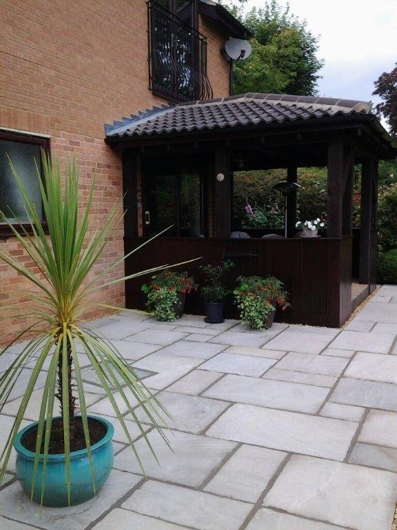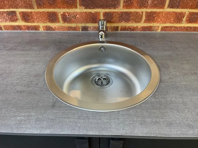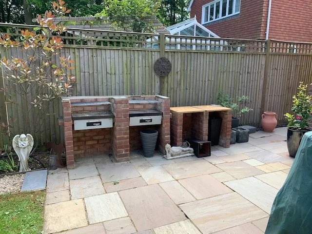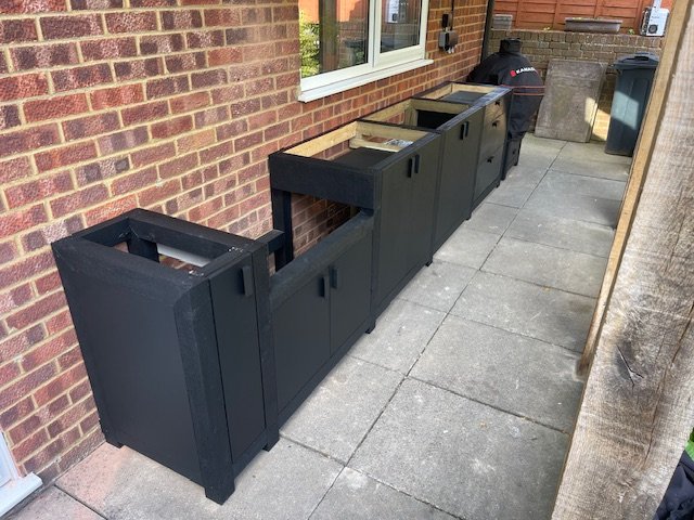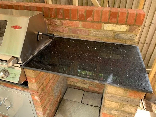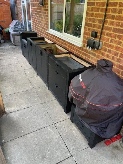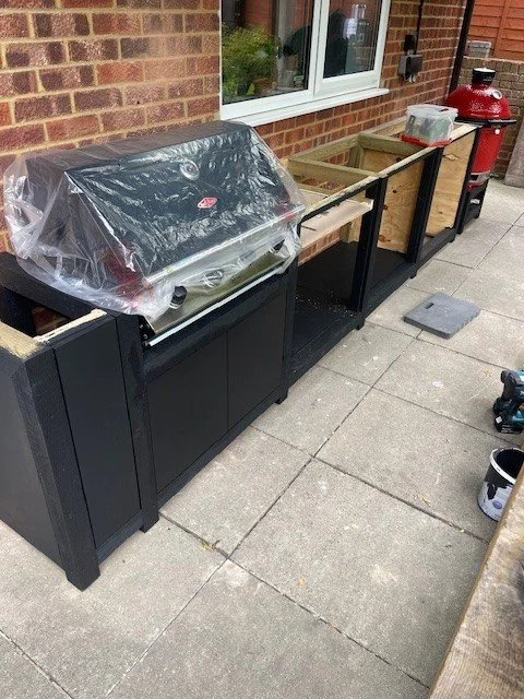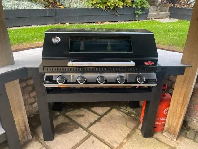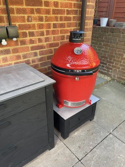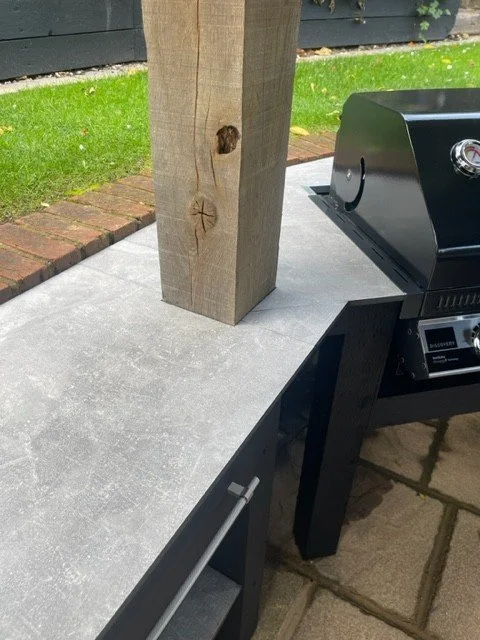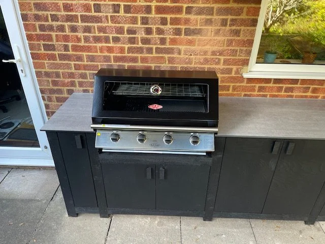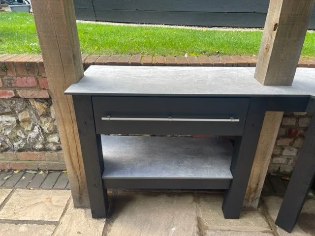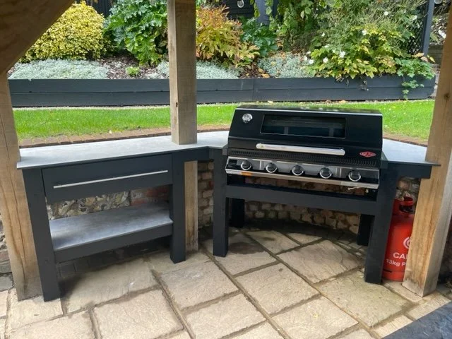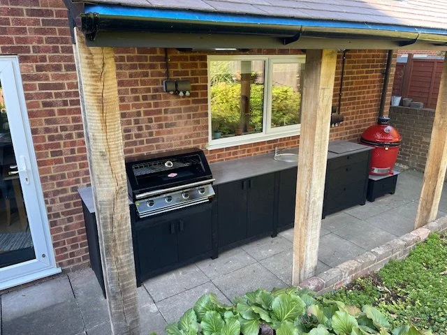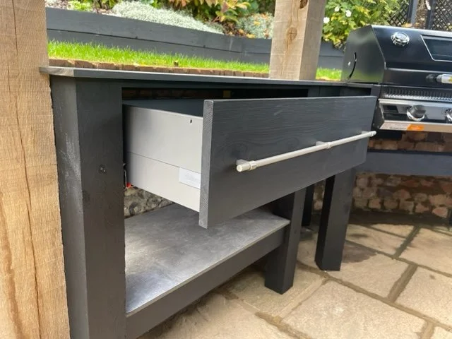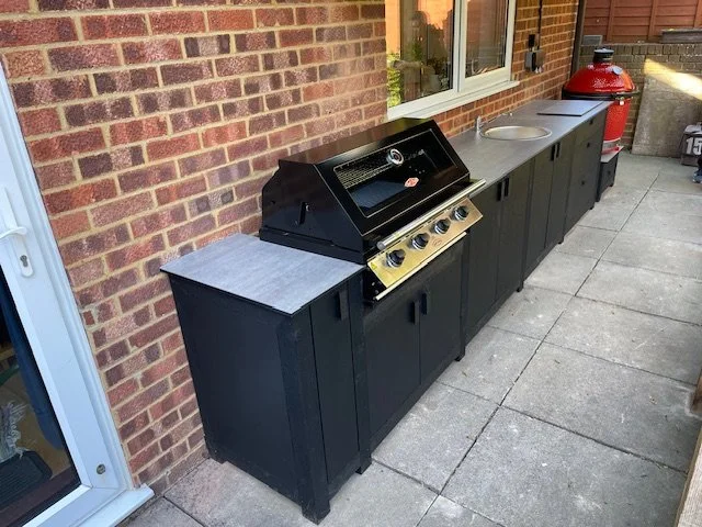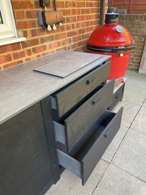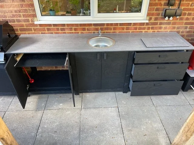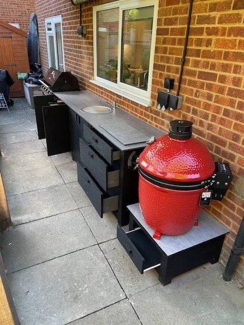 Bespoke made outdoor kitchen area incorporating soft close internal pull out drawers , compact laminate worktops , BBQ grill with additional coal oven & sink with hot & cold running water