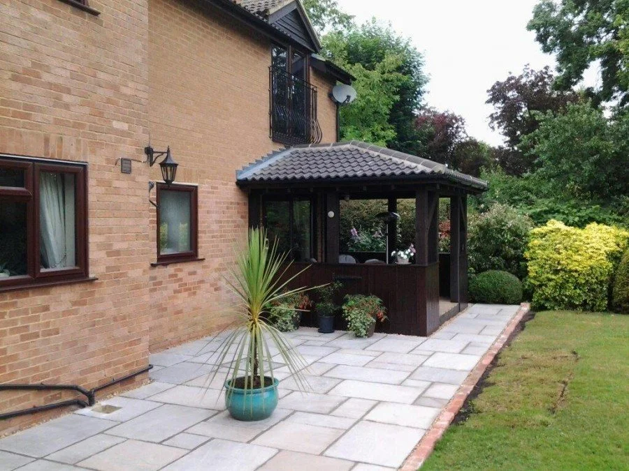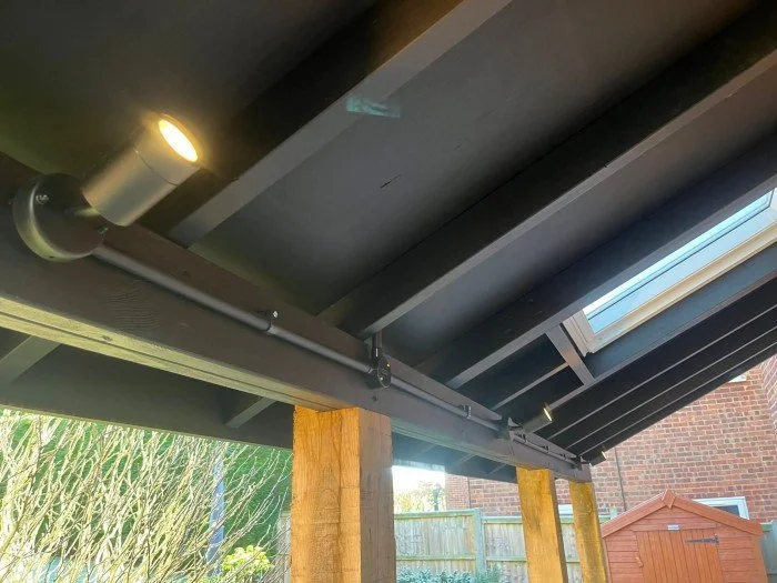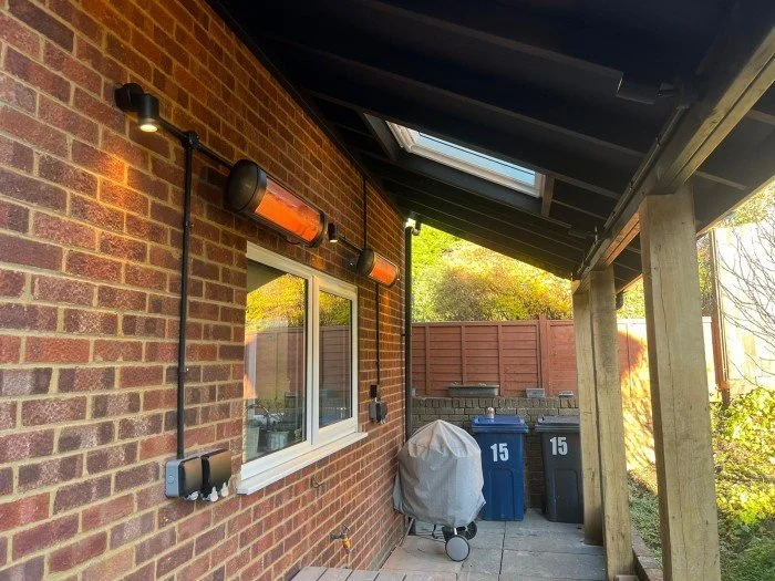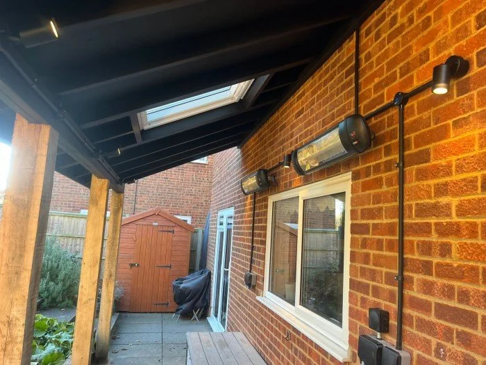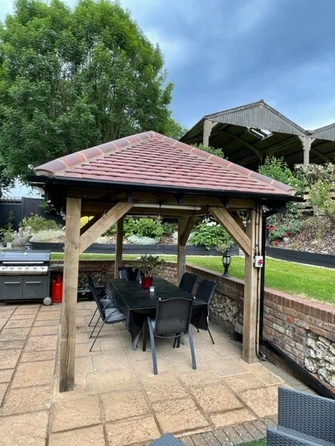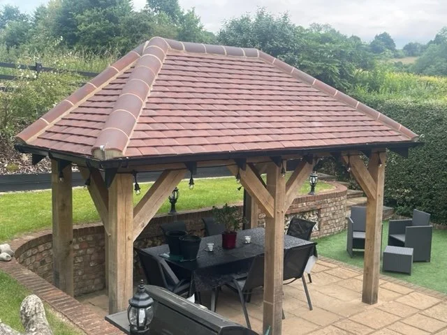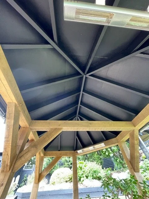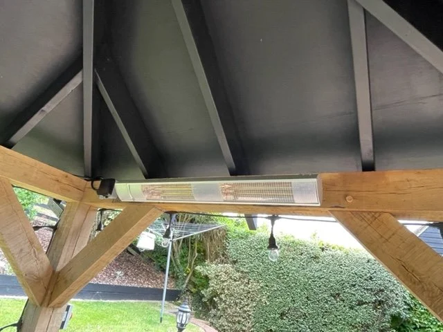 Oak framed garden room incorporating a clay tile hipped roof , electric high mounted infrared heaters & vaulted ceiling
