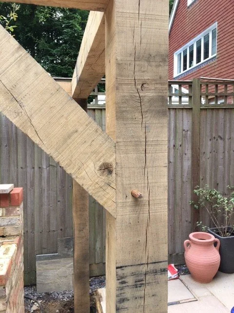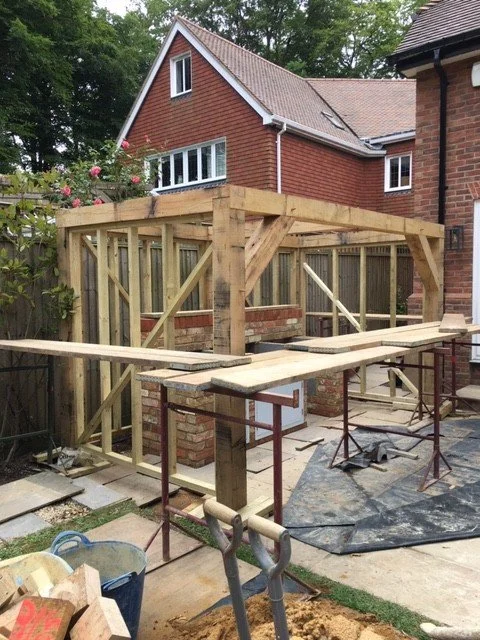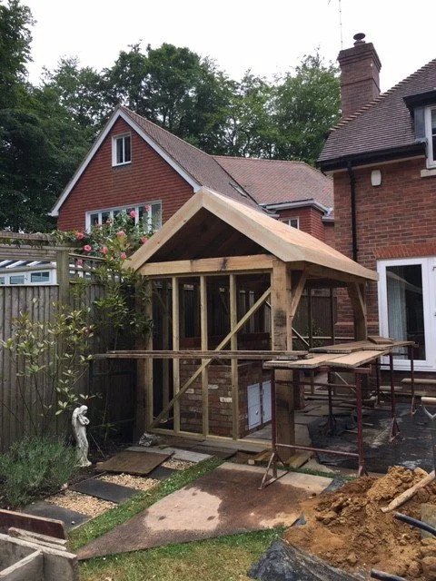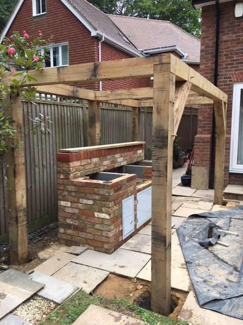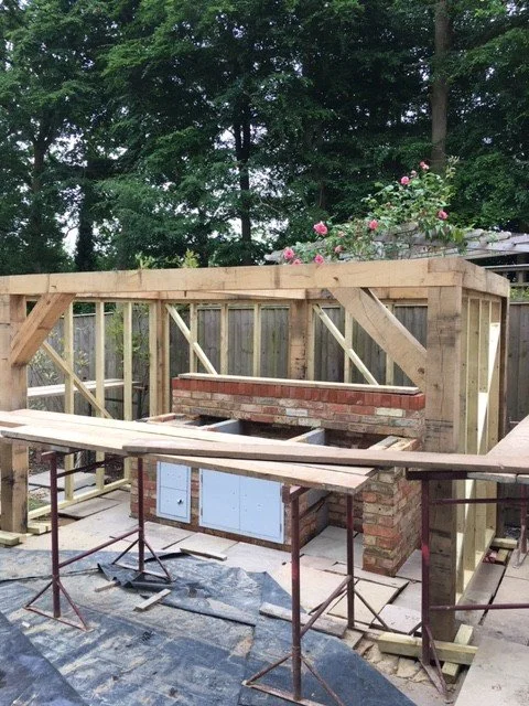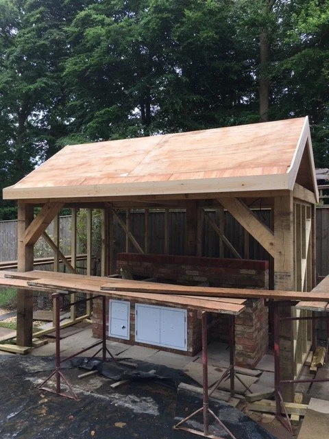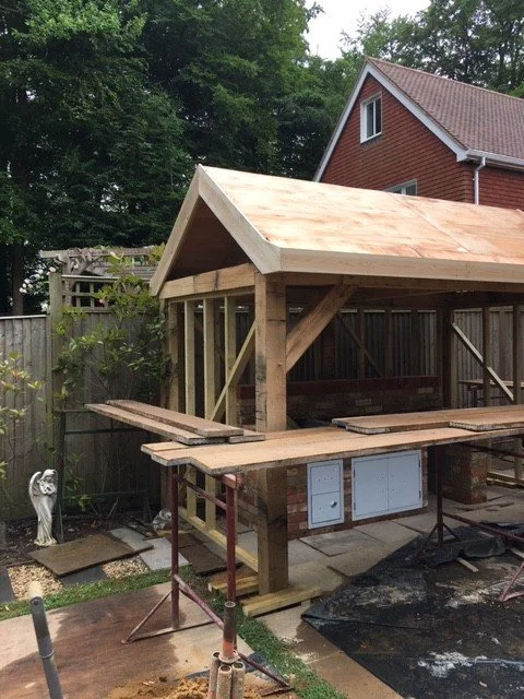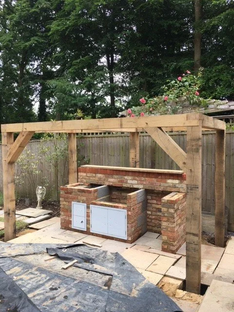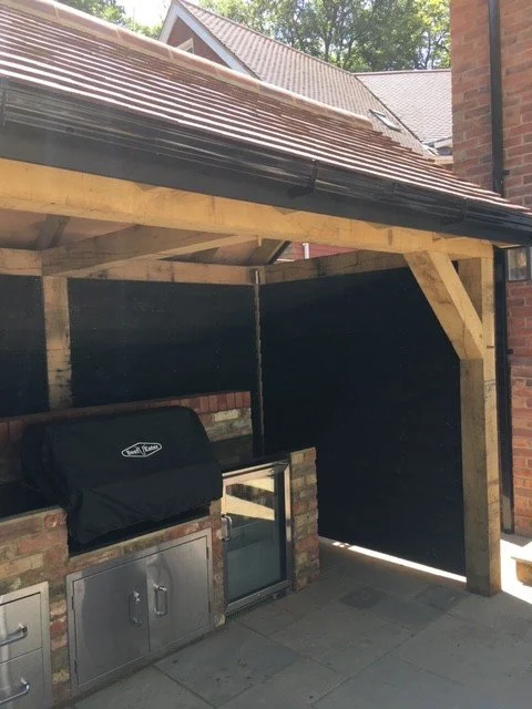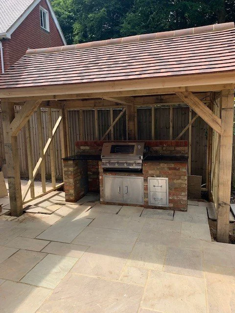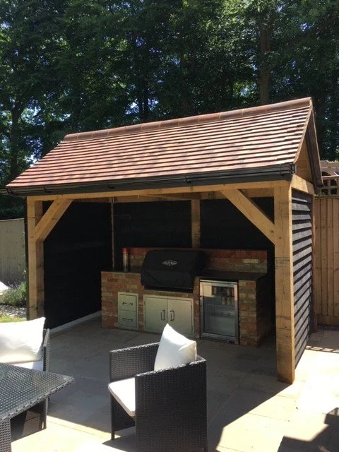 Brick built bespoke BBQ constructed from original stock brick , incorporating grill , fridge , granite worktops , lighting & electrical points . The housing is a solid oak frame with pitched clay tile roof , guttering , downpipes & shiplap cladding .