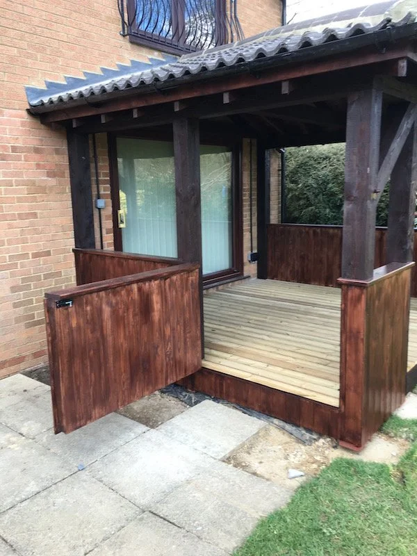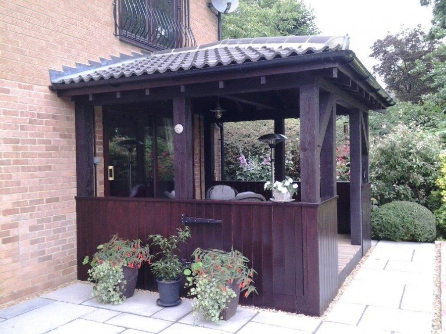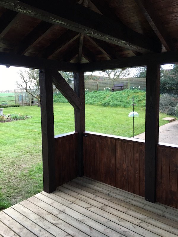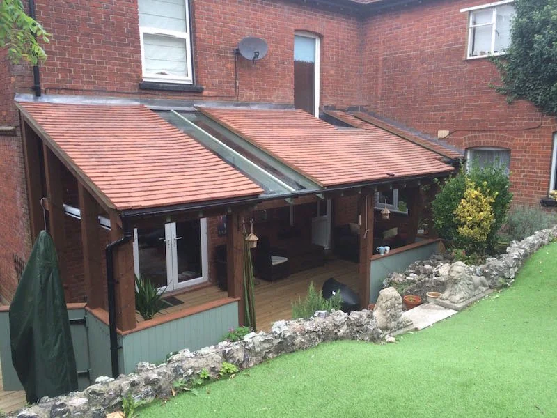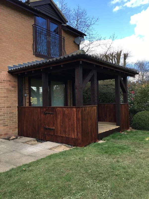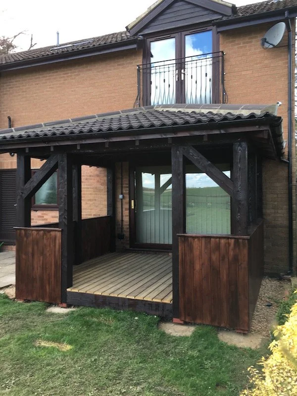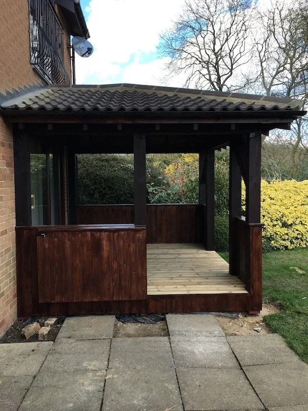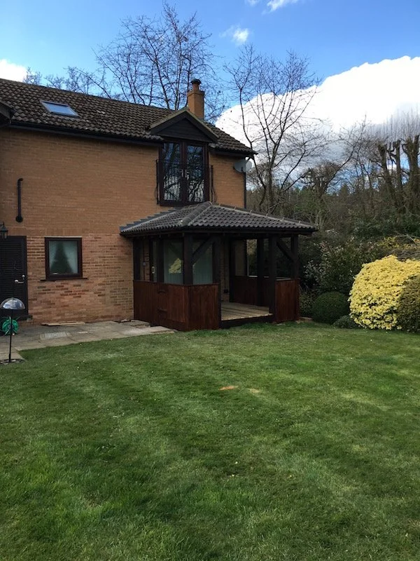Hardwood / softwood custom garden room to include tiled-hipped roof, timber-decked floor base & integrated hinged access door