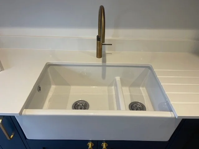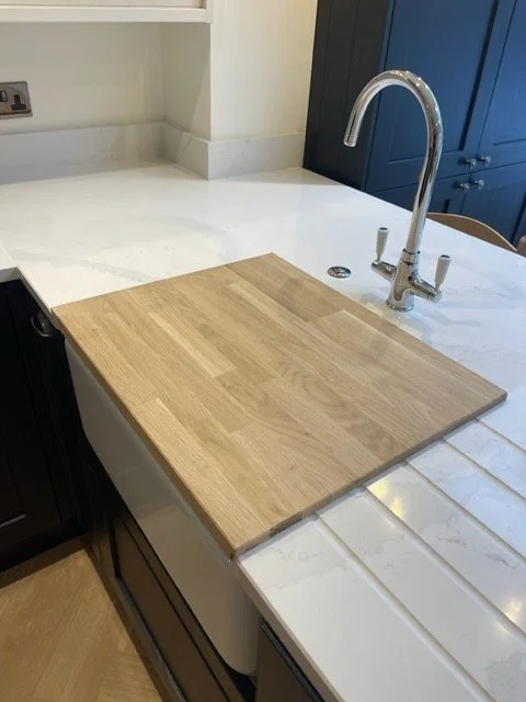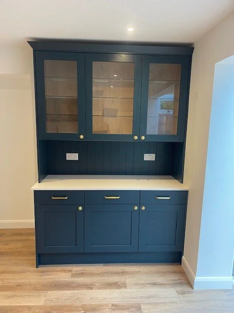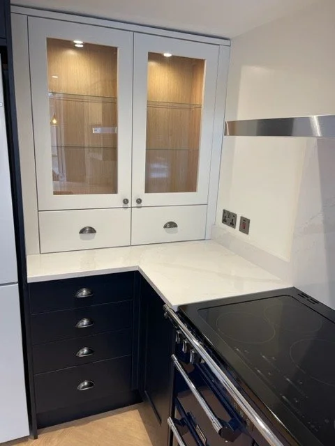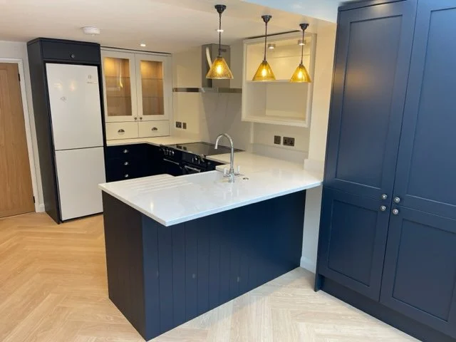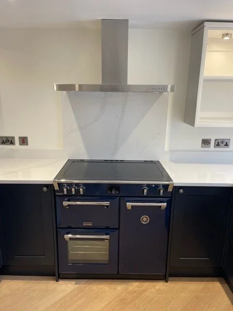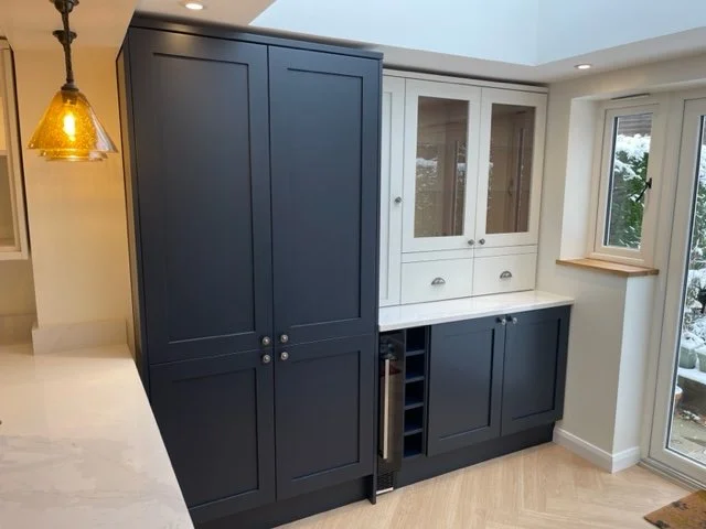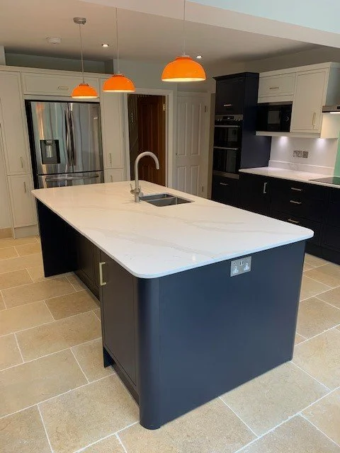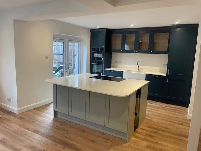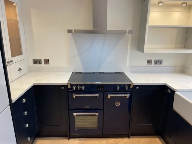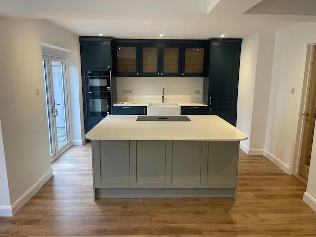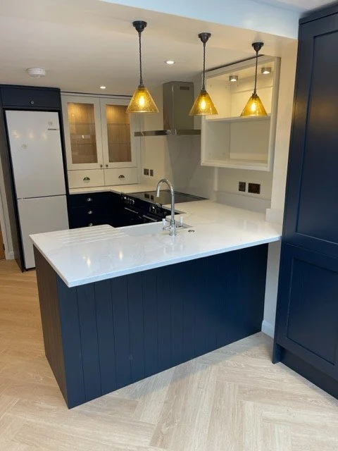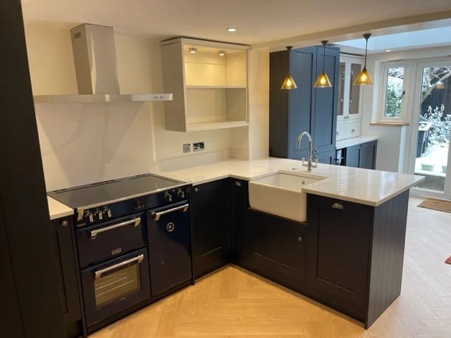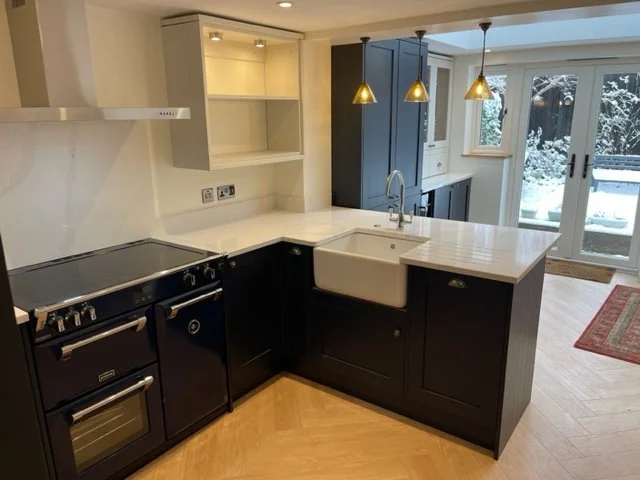Navy blue & porcelain shaker style kitchen incorporating internal L.E.D glass cabinet lighting , Quartz work tops , Splashback & upstands , Belfast sink with bespoke recessed oak block cutting board , Range cooker & laminate oak effect herringbone flooring