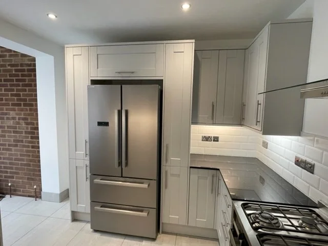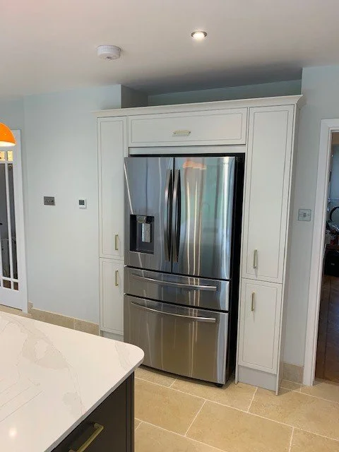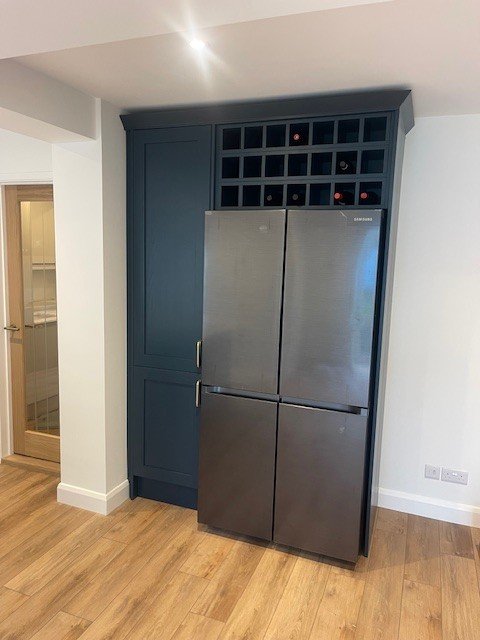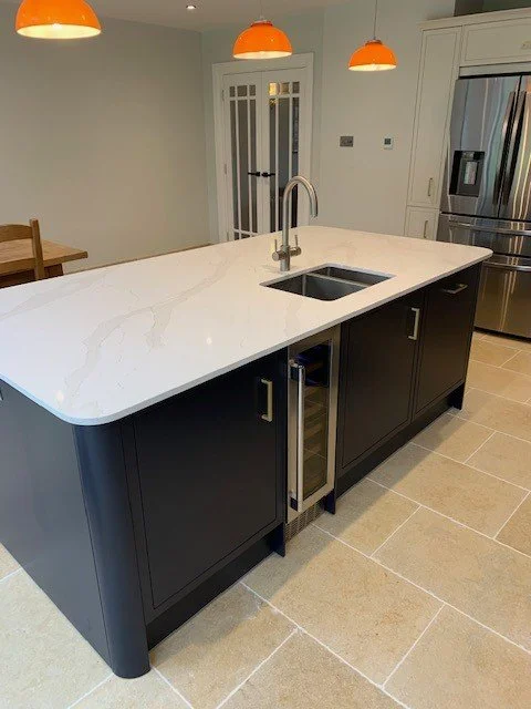 New kitchen extension incorporating central island with quartz worktops & bespoke fridge housing