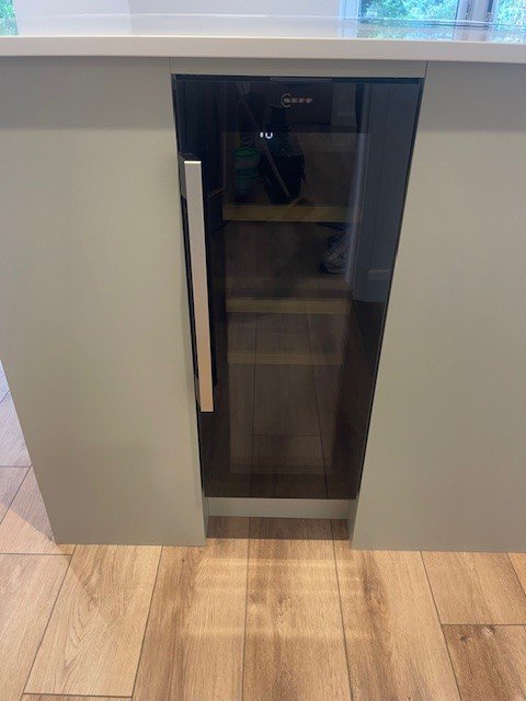 A traditional style wood grained kitchen with a contemporary twist , incorporating quartz worktops , flush recessed ceramic hob , butler style sink with Quooker tap , integrated double ovens , wine fridge housed within the island & stand alone bespoke dresser.