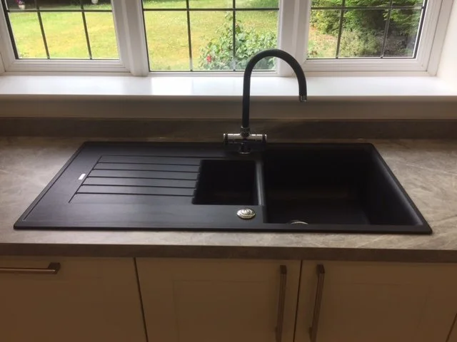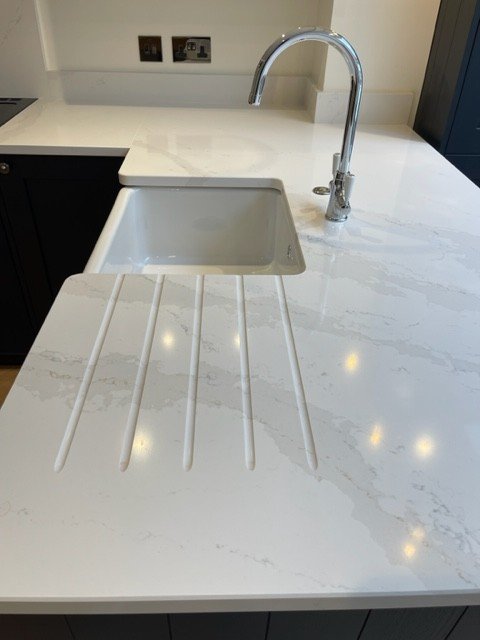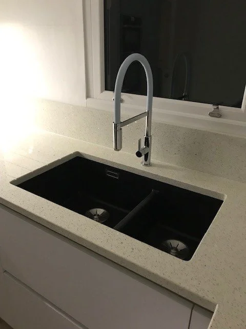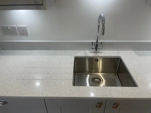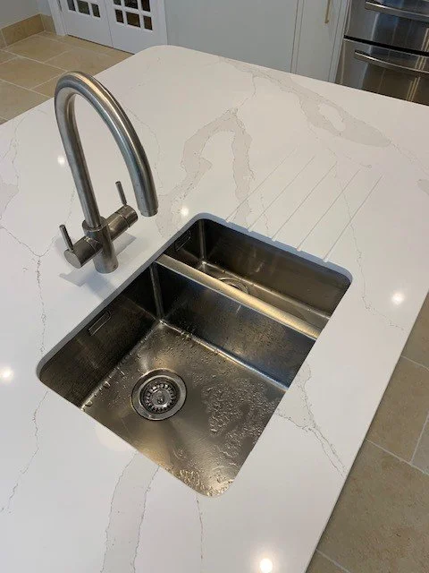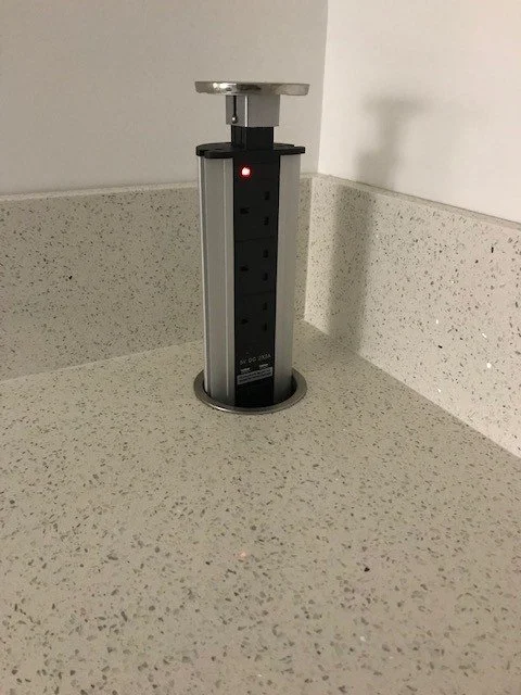 Quartz worktops with under mounted composite sink & pop up USB socket banks