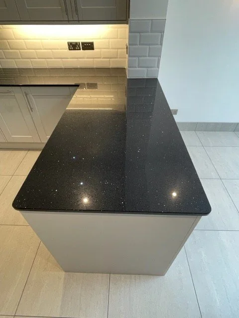 Traditional style kitchen Chen with a contemporary twist incorporating black mirror chip quartz worktops, porcelain floor tiles & a metro wall tile.