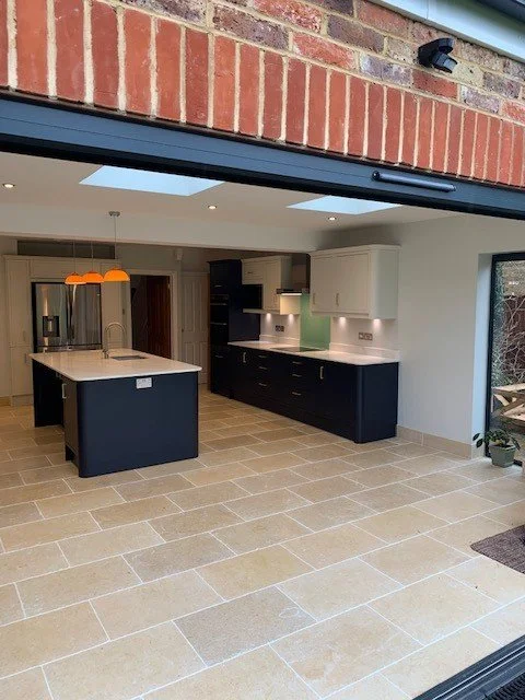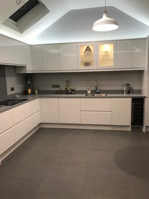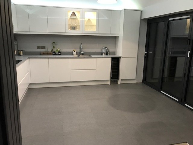 New side extension incorporating white high gloss handless kitchen , Bi-fold doors leading to garden & grey porcelain floor tile