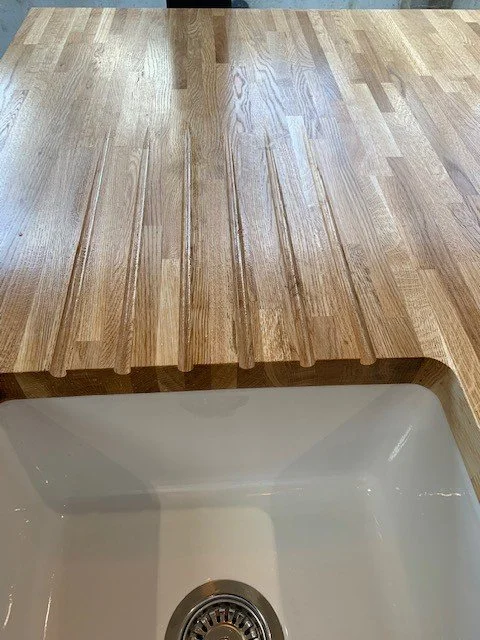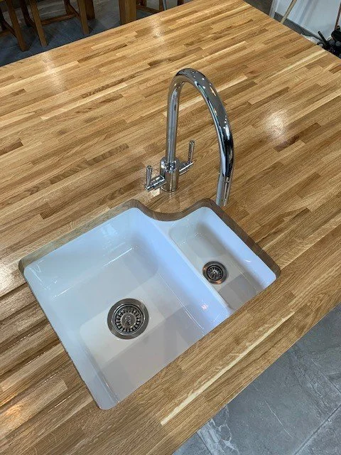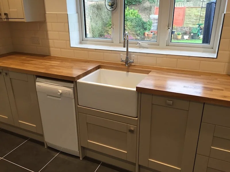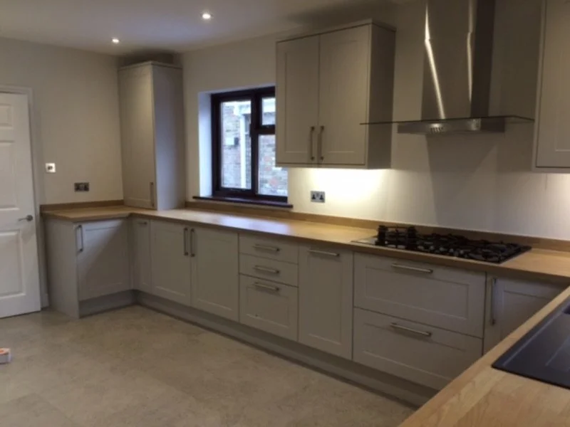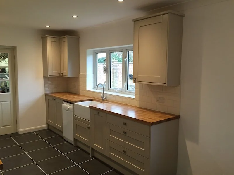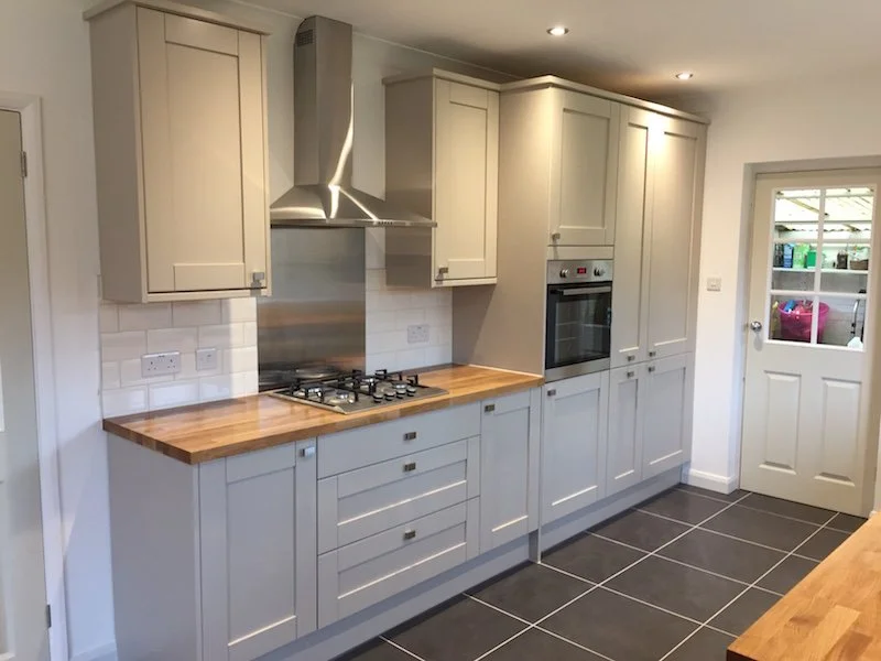 Contemporary matt grey doors and splash backs , solid oak worktops incorporating under mounted Belfast sink