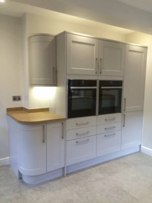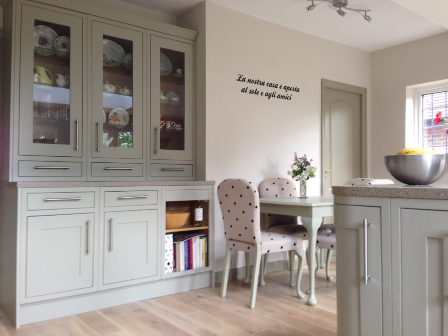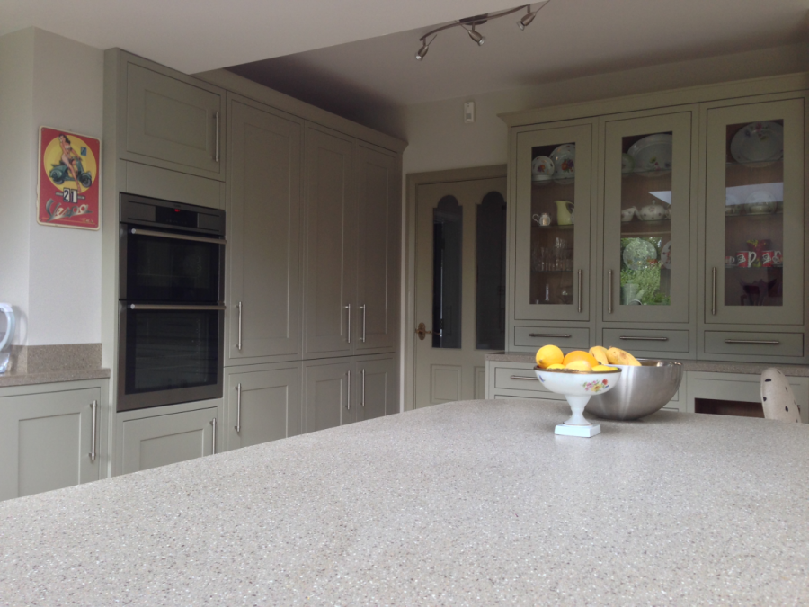 Traditional style dove grey shaker style kitchen incorporating a white mirror chip quartz worktop , undermounted sink , & integrated oven & microwave.