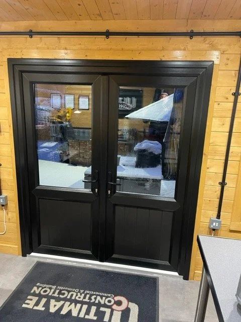 Black woodgrain composite French doors with slated low-level panels