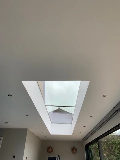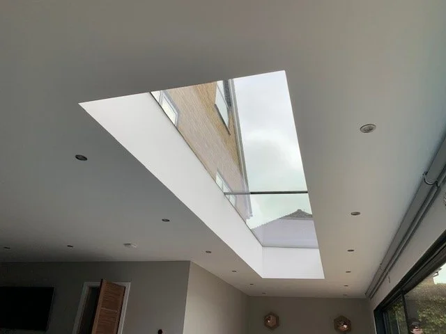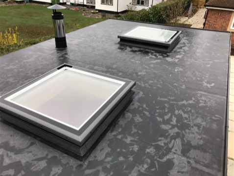 Bespoke made UV filtered flat roof skylights incorporated within a rubber flat roof construction